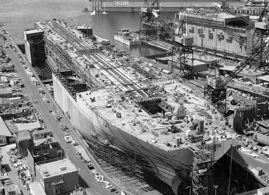 Construction is underway of a super-tanker at the NSSC shipyard in San Diego.
